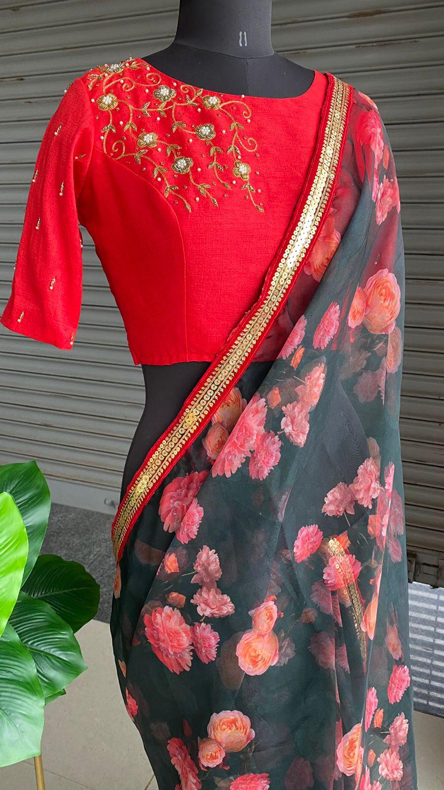 Deep blue floral printed soft organza silk saree with embroidery border works is paired up with red silk embroidery hand worked blouse .