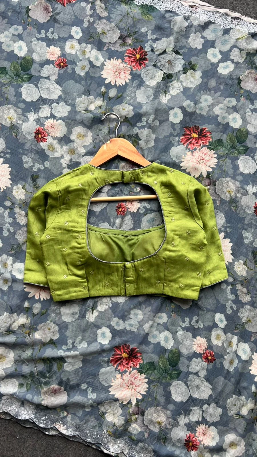 Grey floral chiffon saree with green blouse