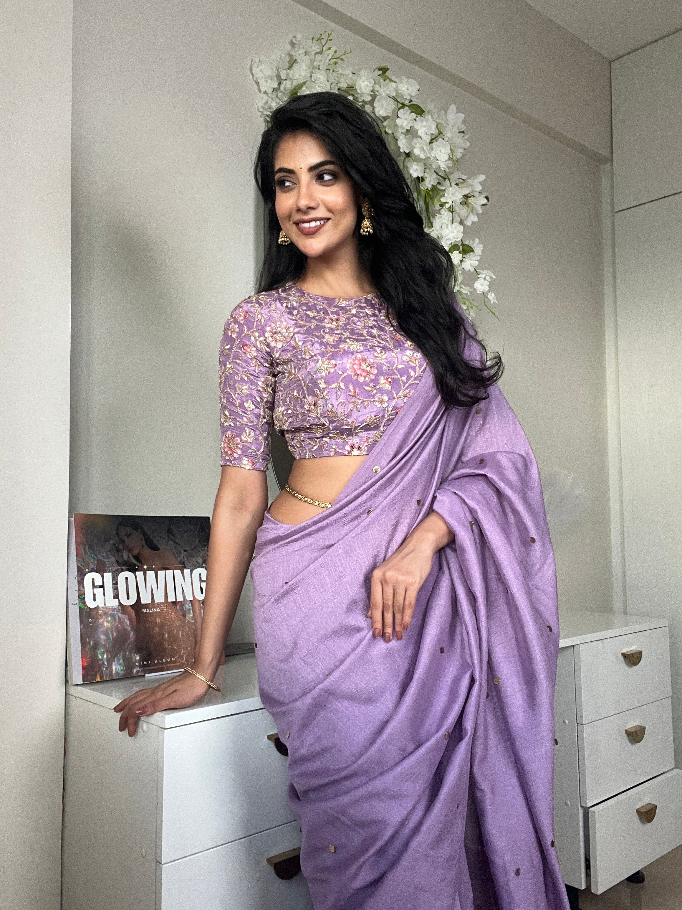 Lavender purple marble silk designer saree with tikki works all over is paired up with matching heavy embroidery worked blouse.