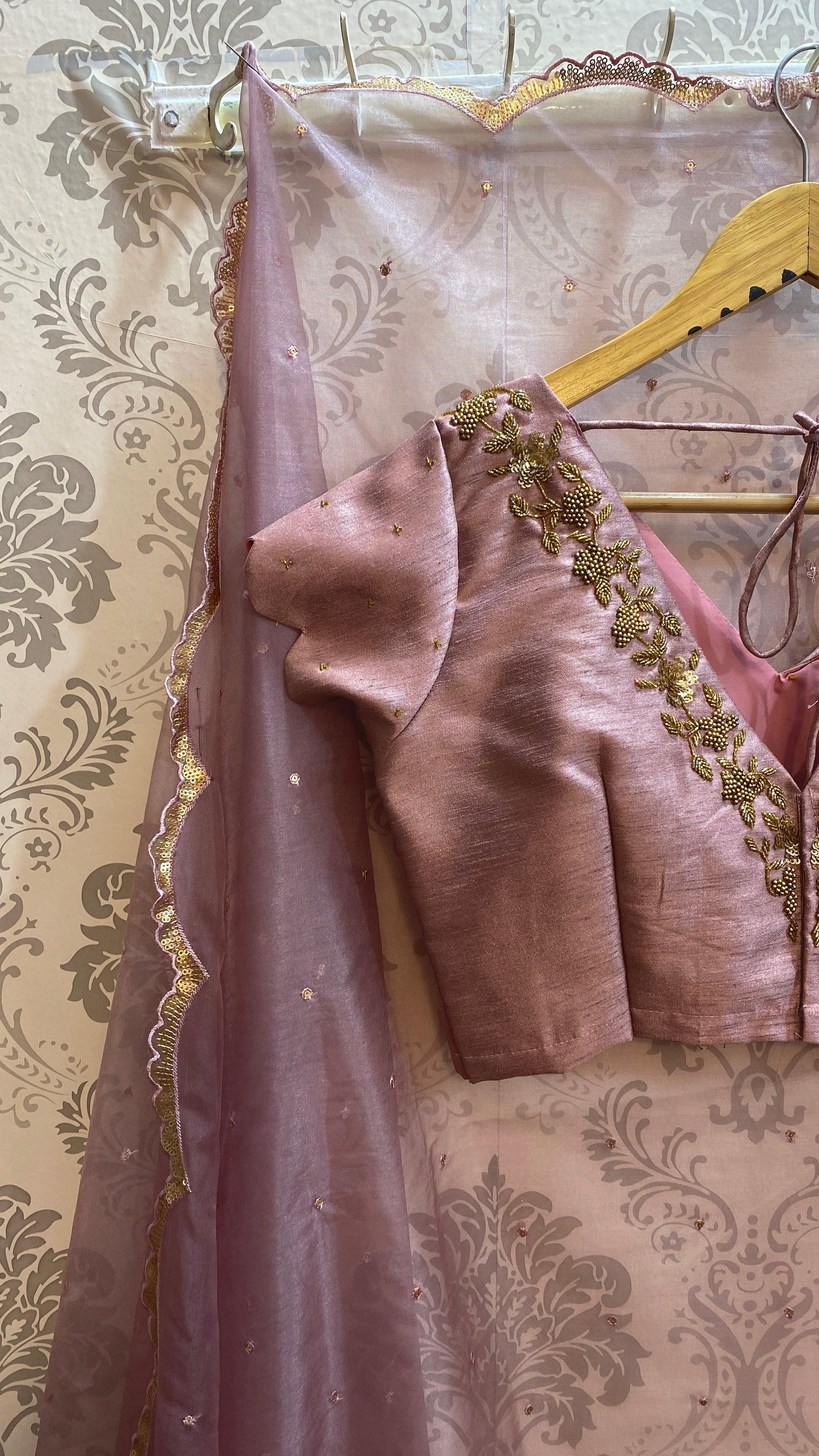 Onion Pink silk blouse is having heavy hand work on V shaped front and back neck and short scalloped sleeves as shown..!!