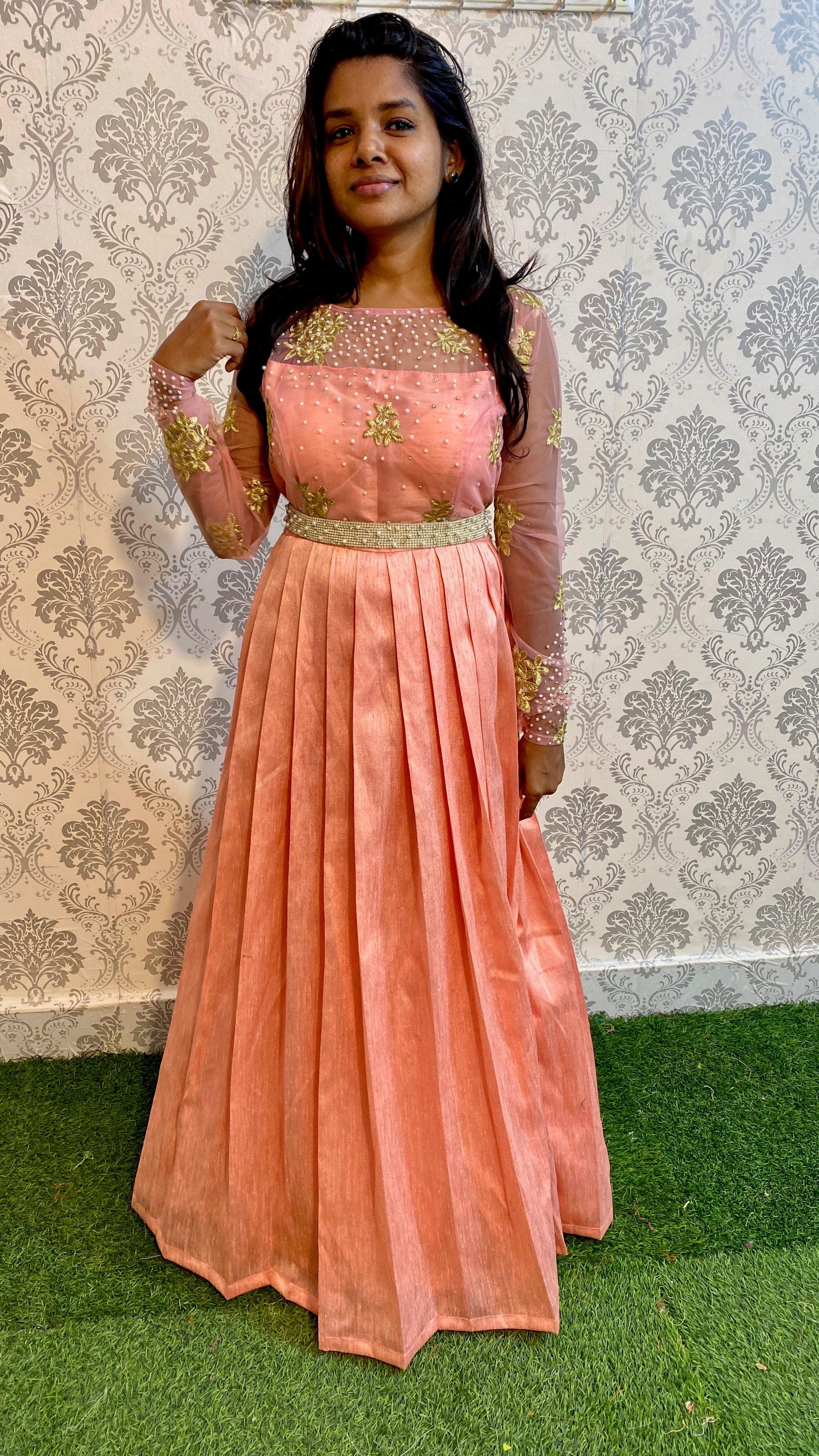 Peach silk party wear gowns with pearl works all over with patterned top with detachable Pearl worked belt..!