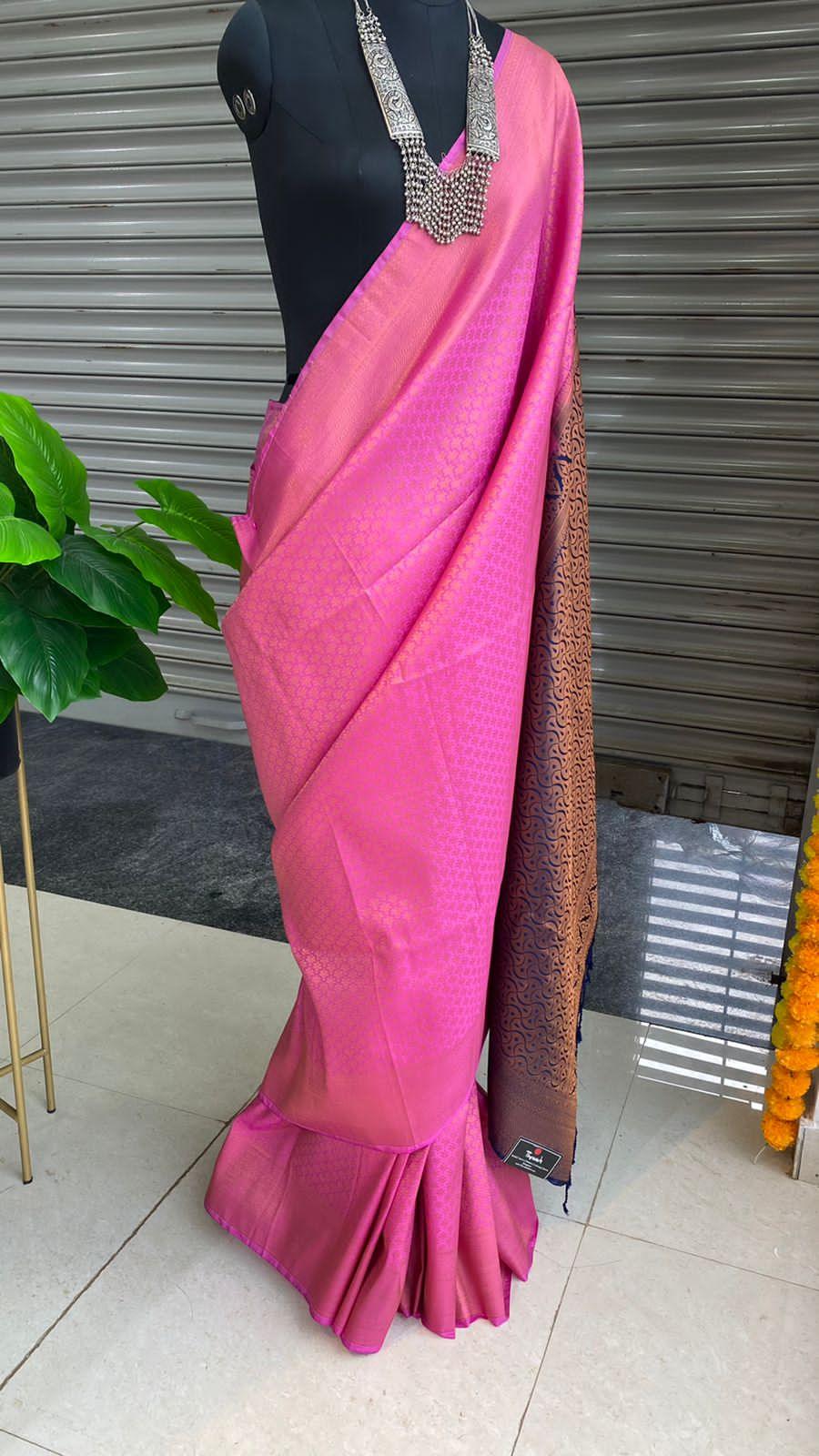 Pink golden zari full weaved soft silk saree having golden zari patterned works all over is paired up with contract Blue golden zari pallu and matching running blouse.