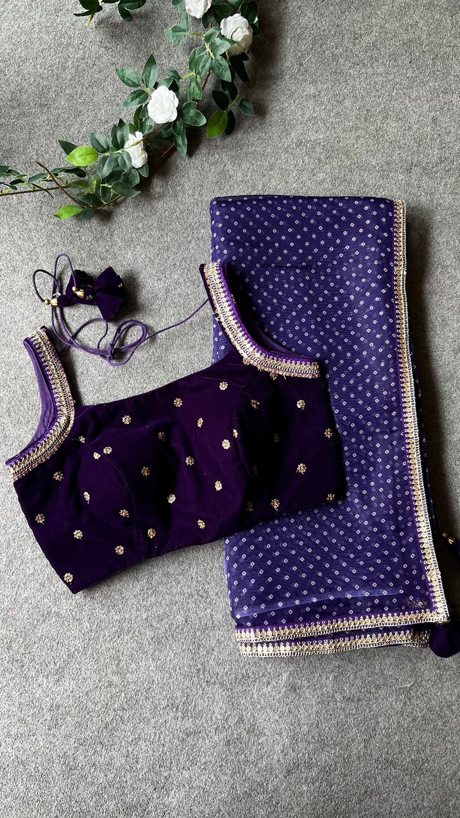 Purple bandhini printed organza saree with heavy embroidery border works comes with purple micro velvet embroidered blouse as shown.