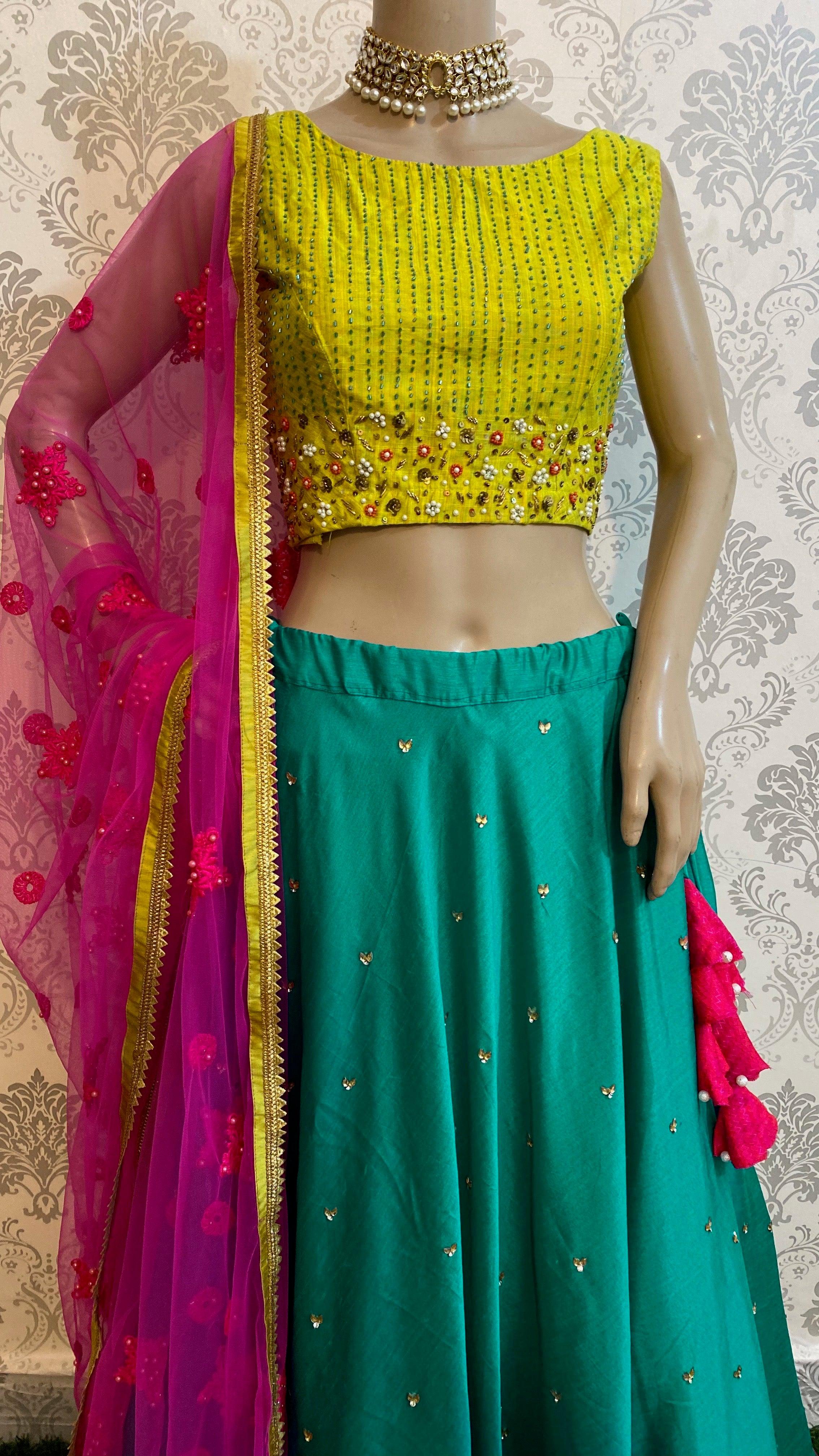 This Sea green silk Lehanga is paired up with a silk lemon yellow silk blouse (Sleeves Available) is paired up with embroidery netted duppata..!!